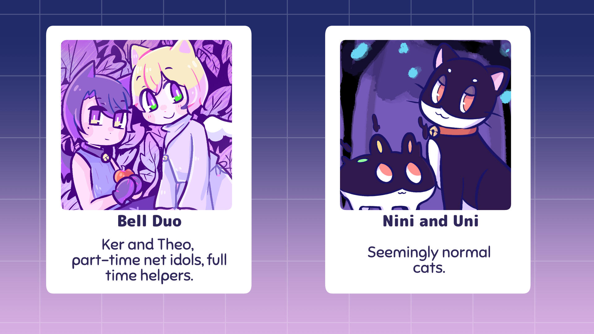 The Bell Duo consists of two members, Theo and Ker. Both are individuals sent by "The Lady of the Bell" to help those on earth. They fufill this task by acting as online idols that create a variety of content such as fortune telling, match making, and variety programs.